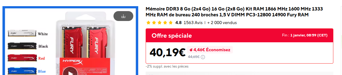 J'ai donc acheté 2 barrettes de 8 Go DDR3 1333 Mhz avec dissipateur thermique sur Aliexpress pour environs 17 euros, ce qui fait 8 euros la barrette mais vous pouvez en avoir pour 5 euros sans le dissipateur soit 10 euros les deux barrettes.